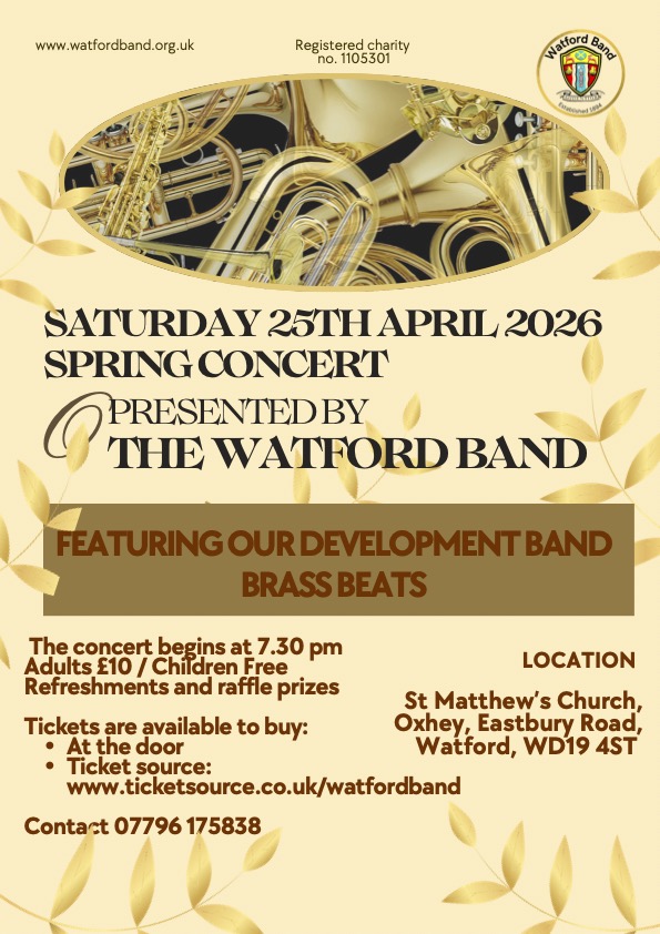 An uplifting evening of music as you celebrate the arrival of spring with a vibrant programme of favourites, classics, and seasonal highlights, beautifully performed by the Watford Band and their Development Band, Brass Beats. Refreshments and raffle prizes available. Saturday 25th April from 7.30pm, at St Matthew’s Church, Oxhey, Eastbury Road, WD19 4ST. Adults £10 and Children free. Tickets on the door, enquiries: 07796 175 838.