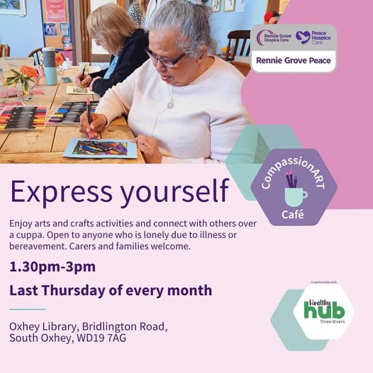 Held at Oxhey Library, Bridlington Road, South Oxhey, WD19 7AG, run in partnership with Three Rivers District Council Healthy Hub. This CompassionART Café will take place on the last Thursday of every month from 1.30pm – 3pm. CompassionART Cafés are drop-in sessions that provide a safe space for people to come together and express themselves through art. They are aimed at anyone who has experienced bereavement, and those who might be lonely due to illness. The sessions include a guided arts and crafts activity and provide a safe space to chat and connect with others, share memories and create lasting connections over a cup of tea.