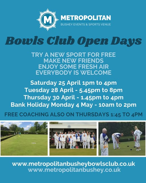 Join the Metropolitan Bowls Club, Aldenham Road, Bushey, WD23 2TR, in Bushey for free, fun open sessions this spring. No experience needed, just wear flat shoes and come along. Open Day dates are Saturday 25 April from 1pm – 4pm. Tuesday 28th April from 5.45pm – 8pm. Thursday 30th April from 1.45pm – 4pm and Bank Holiday Monday 4th May from 10am – 2pm. Plus Free Coaching every Thursday, 1,45pm – 4pm. Bowls is a great way to stay active, improve mobility, boost wellbeing, and meet new people. Drop in and give it a go.
