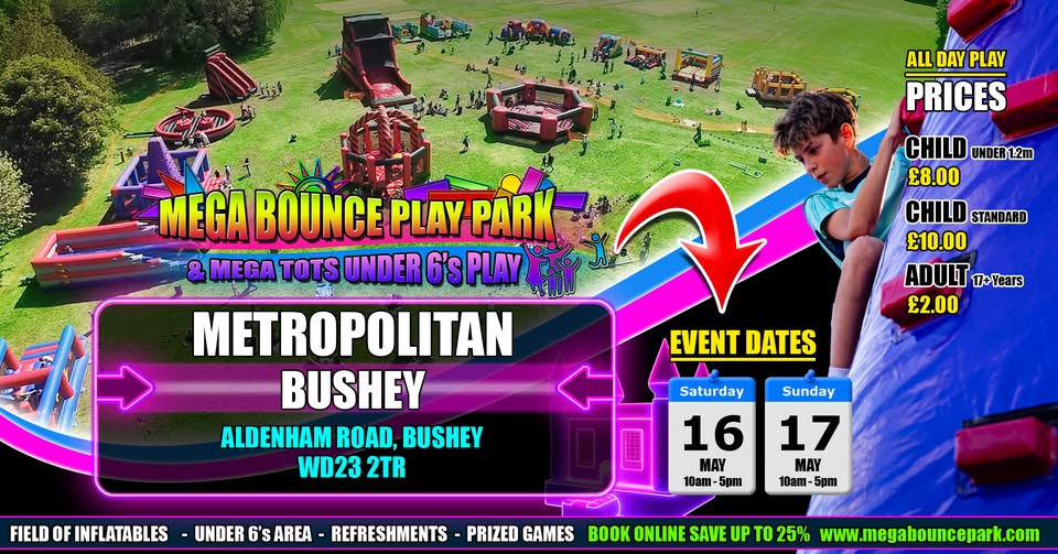 This Field Of Inflatables is designed for all the family and is the perfect day out for high energy bouncing or relaxing while the kids have a blast on massive inflatables, Slide and play in one of the Game Arena Inflatables or enjoy a more relaxed atmosphere in the Under 6’s area. Pay on the day! Cash Preferred, Card Accepted. Saturday 16th and Sunday 17th May from 10am – 5pm. All Day Play. £8 per Child Under 1.2m (Under 6’s Area). £10 per Child Over 1.2m. £2 per Adult – Over 65’s free. Ages 2– Adult (Adults allowed on some inflatables). Hot and cold refreshments available. At Metropolitan Bushey, Aldenham Road, Bushey, WD23 2TR.