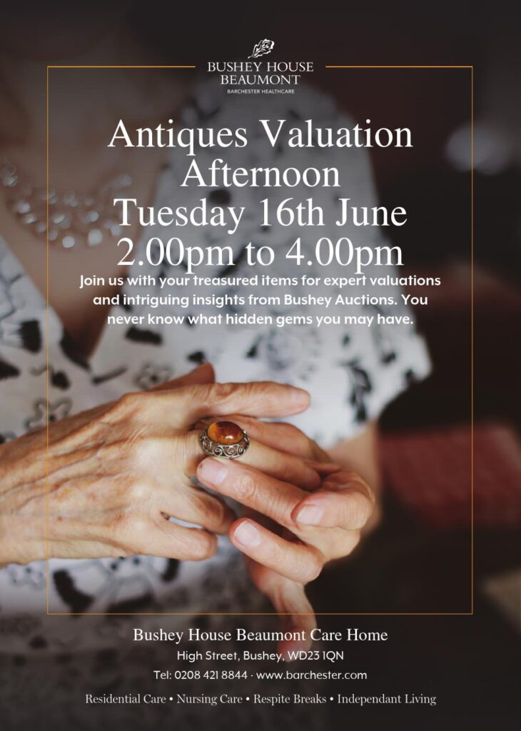 An afternoon with Bushey Auctions. Bring along your treasured items for expert valuations from two antique dealers. Jewellery, art, porcelain, glass, watches, collectibles, anything you think may have a value. Let them know you are coming by calling 020 8421 8844. At Bushey House Beaumont Care Home, High Street, Bushey, WD23 1QN. Please park in Hemp Place or the golf course car park. Tuesday 16th June from 2pm – 4pm.