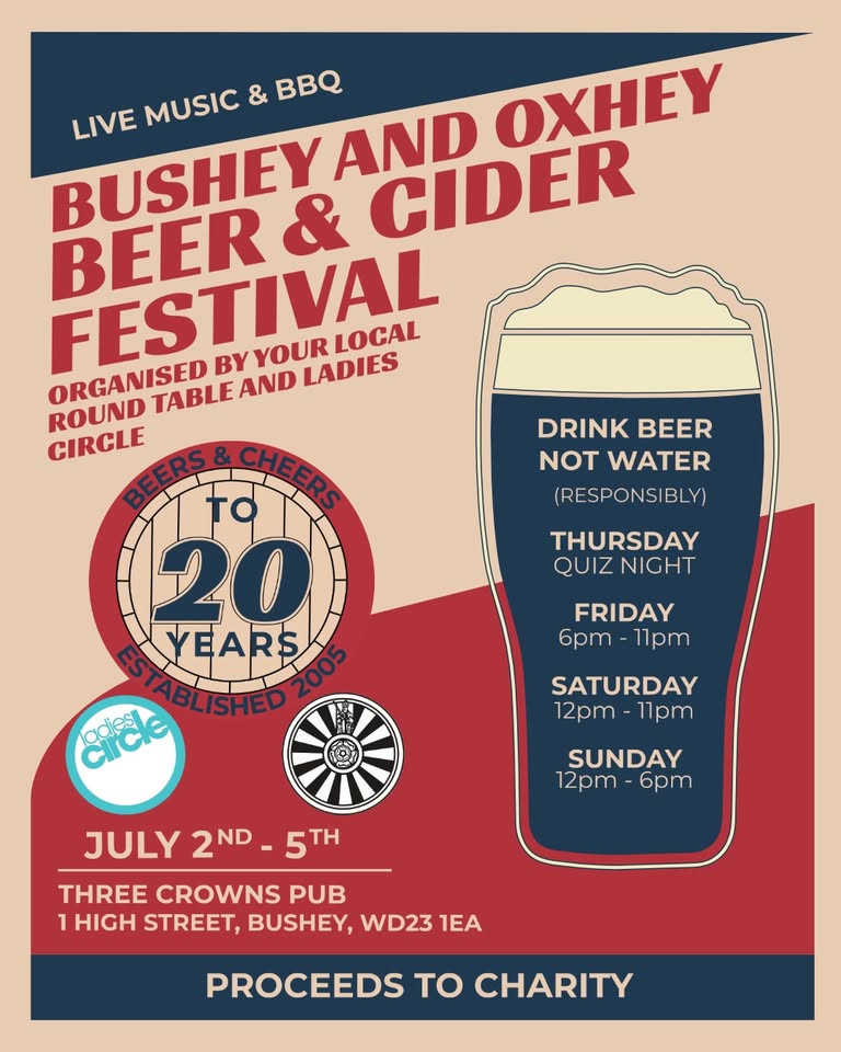 The 20th anniversary of the Bushey and Oxhey Beer and Cider festival will take place Thursday 2nd – Sunday 5th July. With live music, BBQ, and more. At The Three Crowns, High Road, Bushey, WD23 1EA.