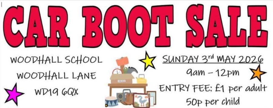 Come along to Woodhall School, Woodhall Lane, WD19 6QX, for this car boot sale, on Sunday 3rd May from 9am – 12 noon.