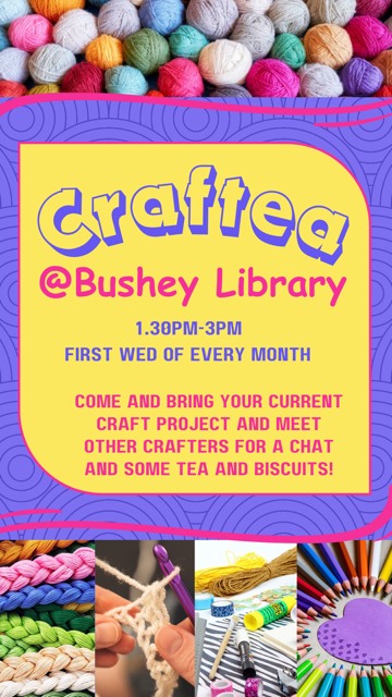 Come and join this crafting group, open to all, drop in, bring your current craft project and have a chat over a cuppa. First Wednesday of the month from 1.30pm – 3pm. At Bushey Library, Sparrows Herne, WD23 1FA.