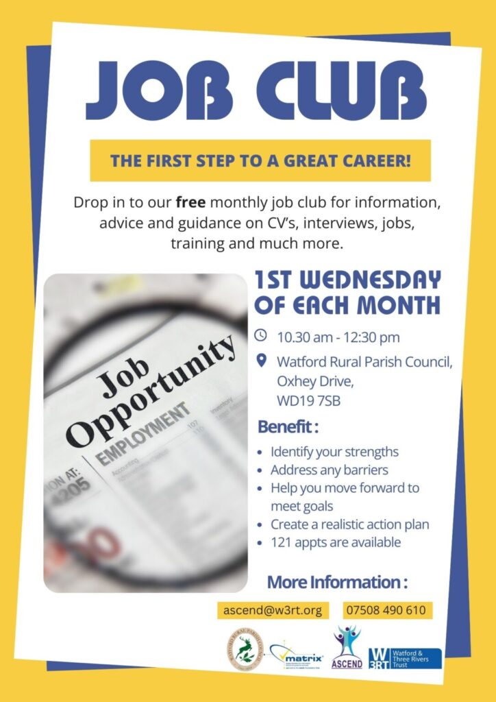 Whether you are job‑hunting, thinking about training, or needing help building confidence, This free Job Club is your first step to real progress. First Wednesday of the month from 10.30am – 12.30pm, at Watford Rural Parish Council, Parish Council Office, Oxhey Drive, South Oxhey, WD19 7SB.