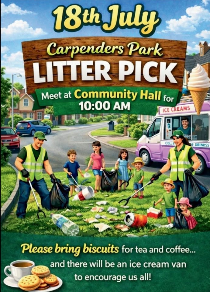Litter picks and bags provided, more than welcome to bring your own litter picks if you have them, in addition to gloves. Meet up at the Carpenders Park Community Hall, Station Footpath/Gibbs Couch, WD19 5EG from 10am, for a 10.30 start, aiming to be back at the hall for around 12 noon. Participants usually concentrate on their own roads, or known hotspots, it is a relaxed event. Saturday 18th July.