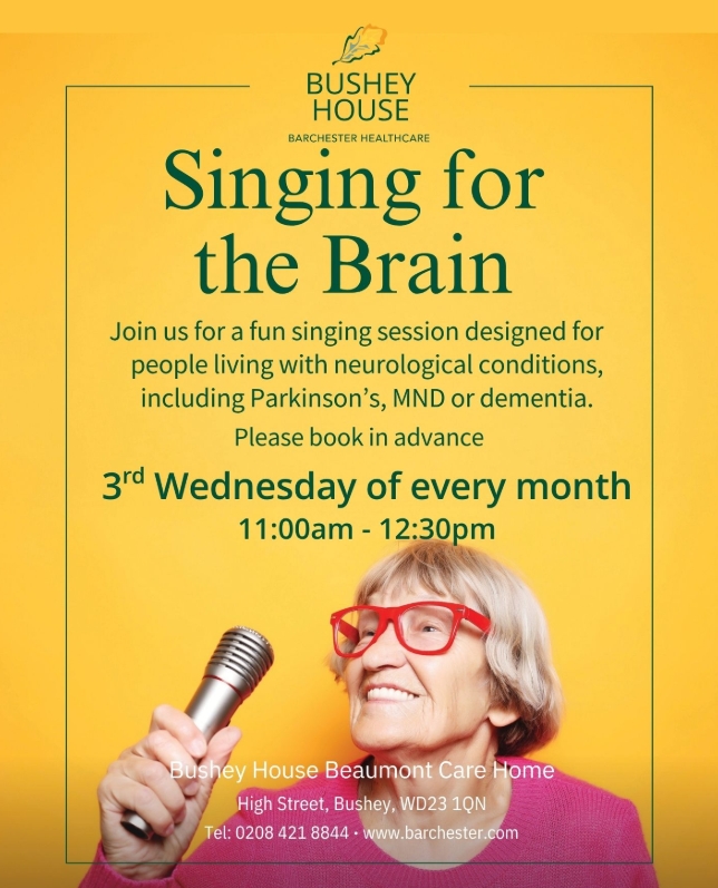 Home Instead Watford have teamed up with Alzheimer’s Society to provide ‘Singing for the Brain’ sessions which will be hosted at Bushey House Beaumont Care Home, High Street, Bushey, WD23 1QN. This will be a fun session aimed at those living with dementia or other neurological and memory conditions such as Parkinson’s, MND and Stroke. It will be held on the 3rd Wednesday of every month from 11am, so come along and bring your voice with you.