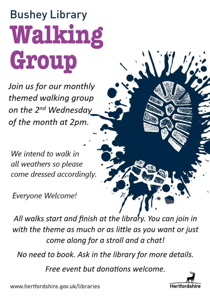 A monthly themed walking group, you can join in with the theme as much or as little as you want or just come along for a stroll and a chat. All walks start and finish at Bushey Library, Sparrows Herne, WD23 1FA. No need to book. Ask in the library for more details. Free event but donations welcome. Second Wednesday of the month from 2pm.