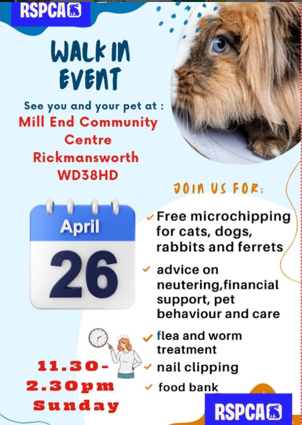 Free microchipping, for cats. dogs, rabbits and ferrets, advice, flea and worm treatment and more at Mill End Community Centre, Old School Building, Church Lane, Mill End, Rickmansworth, WD3 8HD. Sunday 26th April from 11.30am – 2.30pm.