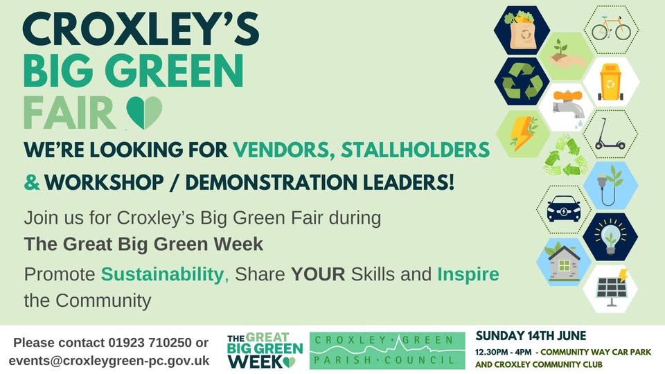 Local businesses, community groups, charities and environmentally-minded organisations will be taking part in this inspiring community event. The event will bring together a wide range of exhibitors celebrating sustainability and positive environmental action, from eco-friendly products and ethical food to organisations helping people live greener lives. At Croxley Green Parish Council Offices and Community Hall, Community Way, WD3 3SU. Sunday 14th June from 12.30pm – 4pm, free entry.
