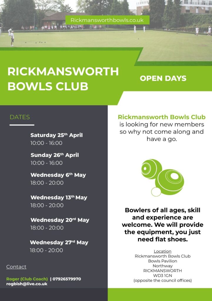 Come along and give bowls a try, Whether you are completely new, bringing friends or family, or just fancy trying something different, everyone is welcome. Just bring flat shoes, they will provide all the equipment, friendly faces guaranteed. At Rickmansworth Bowls Clubs, Basing House, Basing Gardens, Northway, Rickmansworth, WD3 1GN. Saturday 25th and Sunday 26th April from 10am – 4pm.