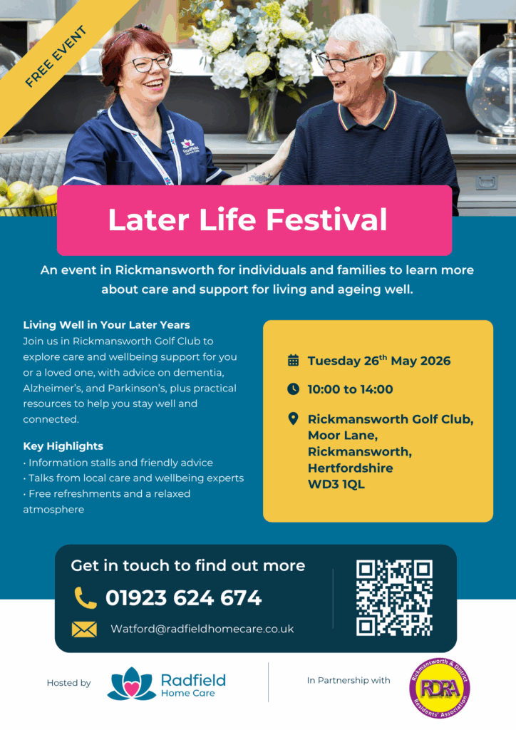 A Later Life Festival on Tuesday 26th May from 10am – 2pm at Rickmansworth Golf Club, Moor Lane, Rickmansworth, WD3 1QL. An event designed for older adults and their families. The day will bring together local organisations, including Memory Support Hertfordshire, Carers in Herts, Watford and Three Rivers Trust, and Age UK. They will offer advice, support, and information on care, wellbeing, and community services. A variety of stallholders will be in attendance, providing visitors an opportunity to ask questions, access resources, and connect with local support networks.