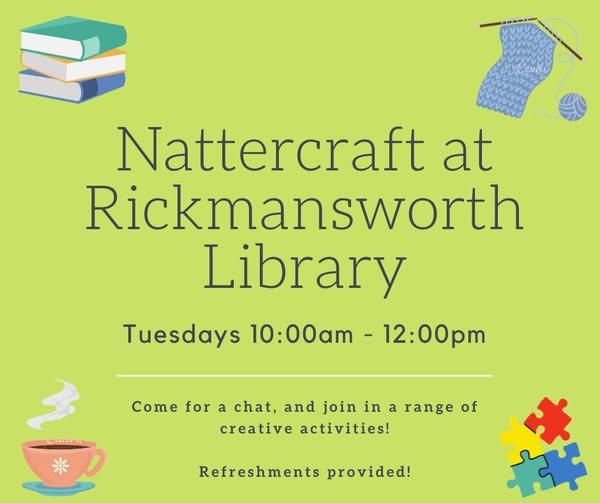 Open to all, from absolute beginners to experienced knitters. Bring along all your crafts whilst enjoying a chat. At Croxley Green Library, Barton Way, Croxley Green, Rickmansworth, WD3 3HB. Fridays from 10am – 12 noon.