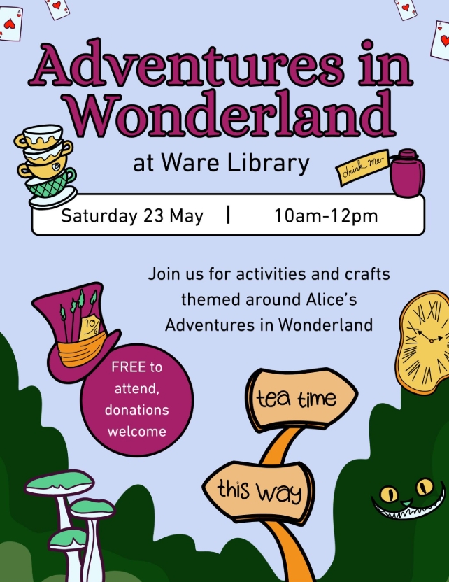 Join Ware Library, High Street, Ware, SG12 9BA, on Saturday 23rd May from 10am – 12 noon, for a Wonderland adventure. They will have crafts and activities based on Alice’s Adventures in Wonderland for children aged 3+. This event is free to attend, with donations welcome.