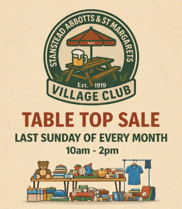 Whether you are hunting for a bargain, having a clear out, or just fancy a browse and a cuppa, come along to this table top sale every last Sunday of the month from 10am – 2pm. Until the end of November. At Stanstead Abbotts and St Margarets Village Club, High Street, Stanstead Abbotts, Ware, SG12 8AB.
