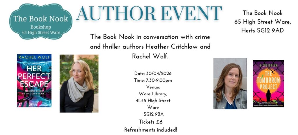The Book Nook bookshop welcome acclaimed crime writers Heather Critchlow and Rachel Wolf to Ware Library, High Street, Ware, SG12 9BA. Thursday 30th April from 7.30pm – 9pm. To book click here