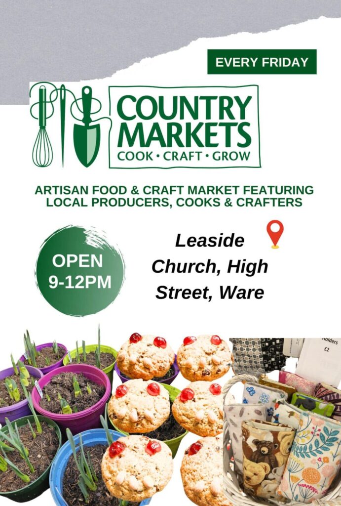 Weekly Country Market with plenty of goods on offer from local bakers, producers and makers all under one roof. Fridays from 9am – 12 noon. At Leaside Church and Community Centre, High Street, Ware, SG12 9BT.