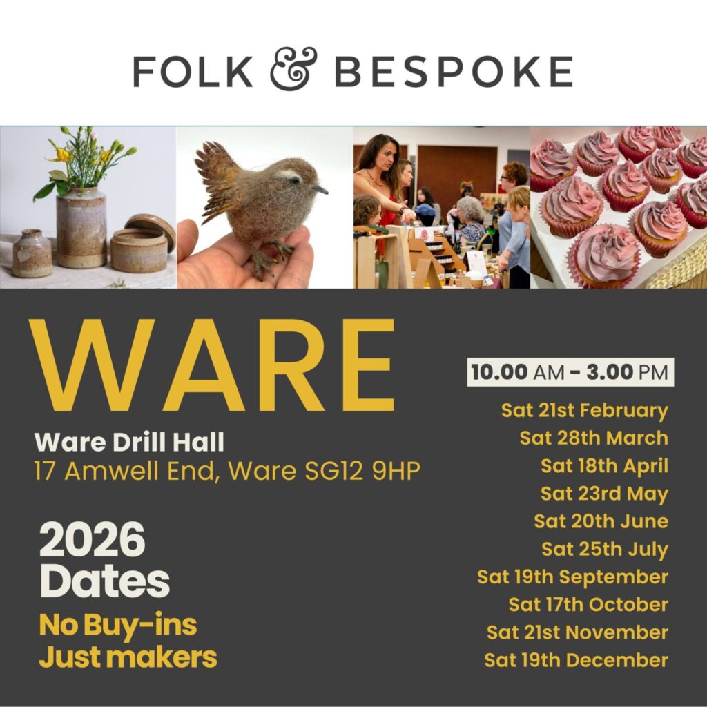 Folk and Bespoke prides itself as being different, they aim to be a unique shopping experience, a celebration of small independent businesses and time served craftspeople. Free entry, at Ware Drill Hall, 17 Amwell End, Ware, SG12 9HP, Saturday from 10am – 3pm.