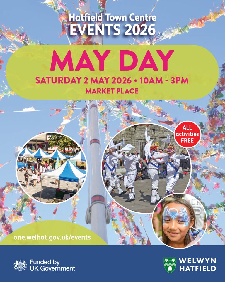 A family event with music, Morris Dancers, market stalls and face painting. Saturday 2nd May from 10am – 3pm, at Market Place, Hatfield.