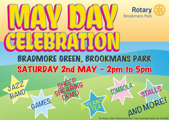 May Day celebration with jazz band, games, tombola, stalls, sheep shearing demo and more. At Bradmore Green, Brookmans Park, Hatfield. Saturday 2nd May from 2pm – 5pm.