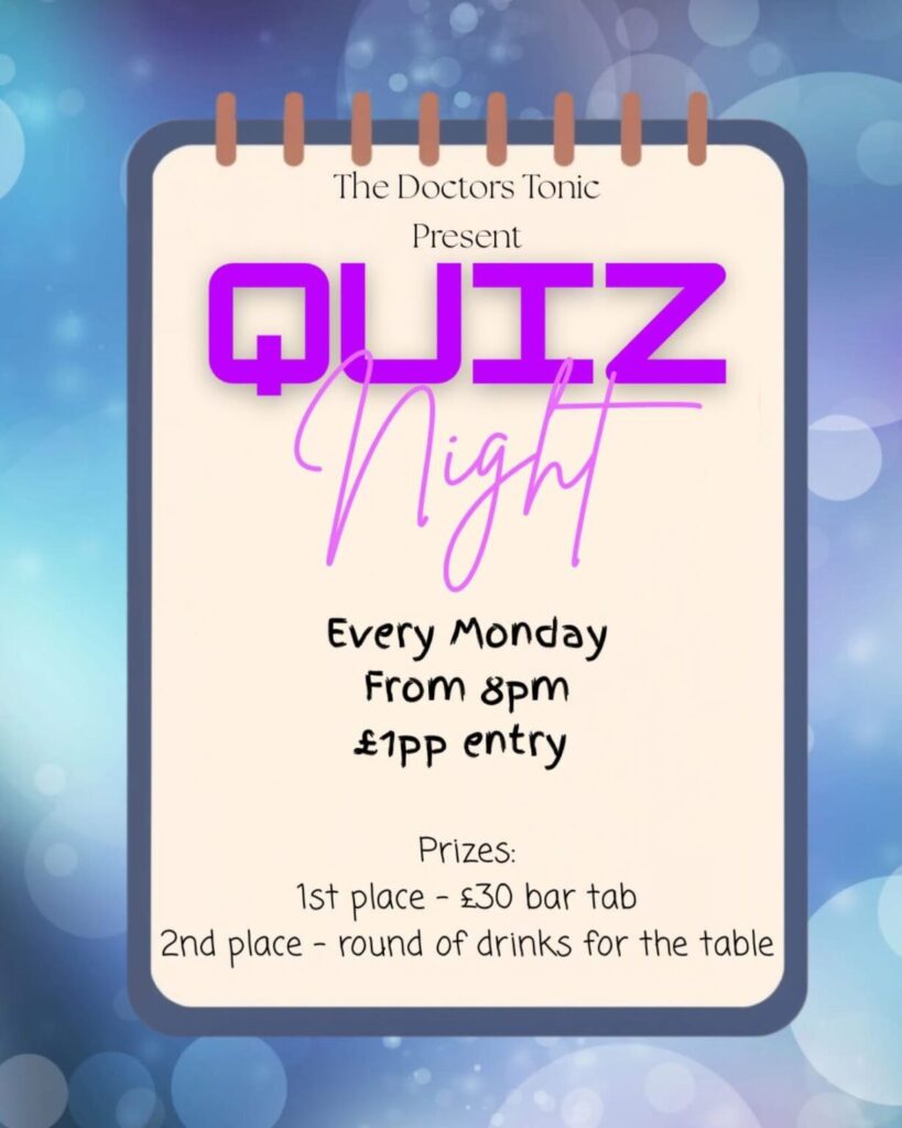 Quiz night at The Doctors Tonic, Church Road, Welwyn Garden City, AL8 6PS. Every Monday from 8pm until at least end of June.