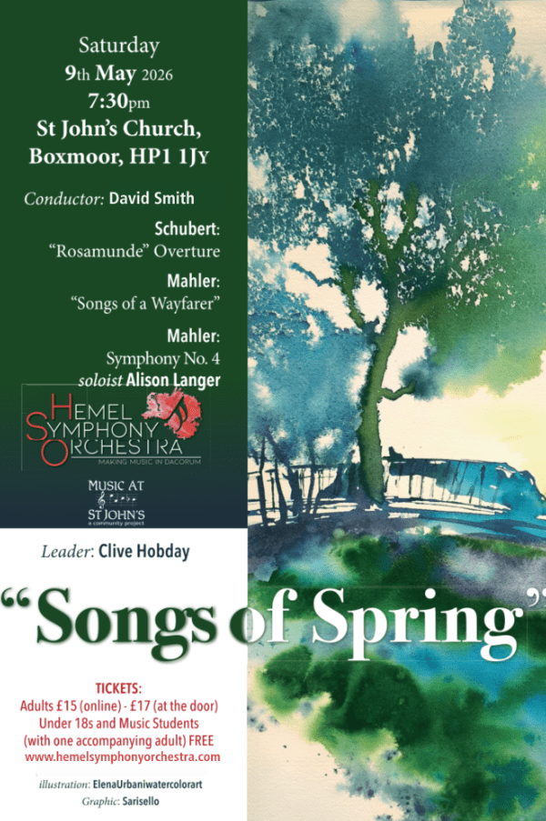 St John’s Church, Boxmoor, Hemel Hempstead, HP1 1JY, next concert will be “Songs of Spring” featuring music by Schubert and Mahler. The programme includes, Schubert, Rosamunde Overture, Mahler, Songs of a Wayfarer – Soprano, Alison Langer and Mahler, Symphony No. 4. Saturday 9th May from 7.30pm. To book click here