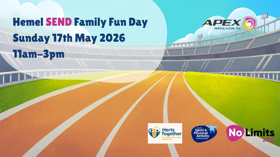 An exciting SEND Family Fun Day at Jarman Park Athletics Track, Jarman Park, Hemel Hempstead HP2 4JS, on Sunday 17th May from 11am – 3pm. This free inclusive and celebratory event invites children, adults and their carers/families to come together for a day packed with fun, activity and teamwork. The morning will feature a carousel of engaging sports/athletics activities, giving everyone the chance to try something new in a supportive and welcoming environment. In the afternoon, get ready for some friendly competition with team relay races. T-shirts are provided for all participants. There’s something for the whole family to enjoy, including inflatables available throughout the day, making it a perfect opportunity to relax, play and connect with others. There will be teas and coffees available to purchase on the day but no food outlets so they suggest that you bring a picnic with you. To register click here