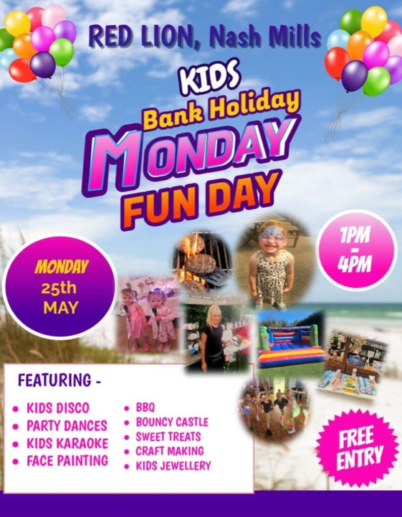 Bank Holiday Monday fun day at The Red Lion, Nash Mills, London Road, Hemel Hempstead, HP3 9TD. With kids disco, kids karaoke, face painting, bouncy castle, craft making and more, Free entry. Monday 25th May from 1pm – 4pm.