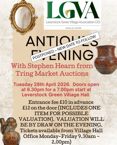 Antiques Evening at Leverstock Green Village Hall, Hemel Hempstead, HP3 8QG. On Tuesday 28th April from 7pm start.