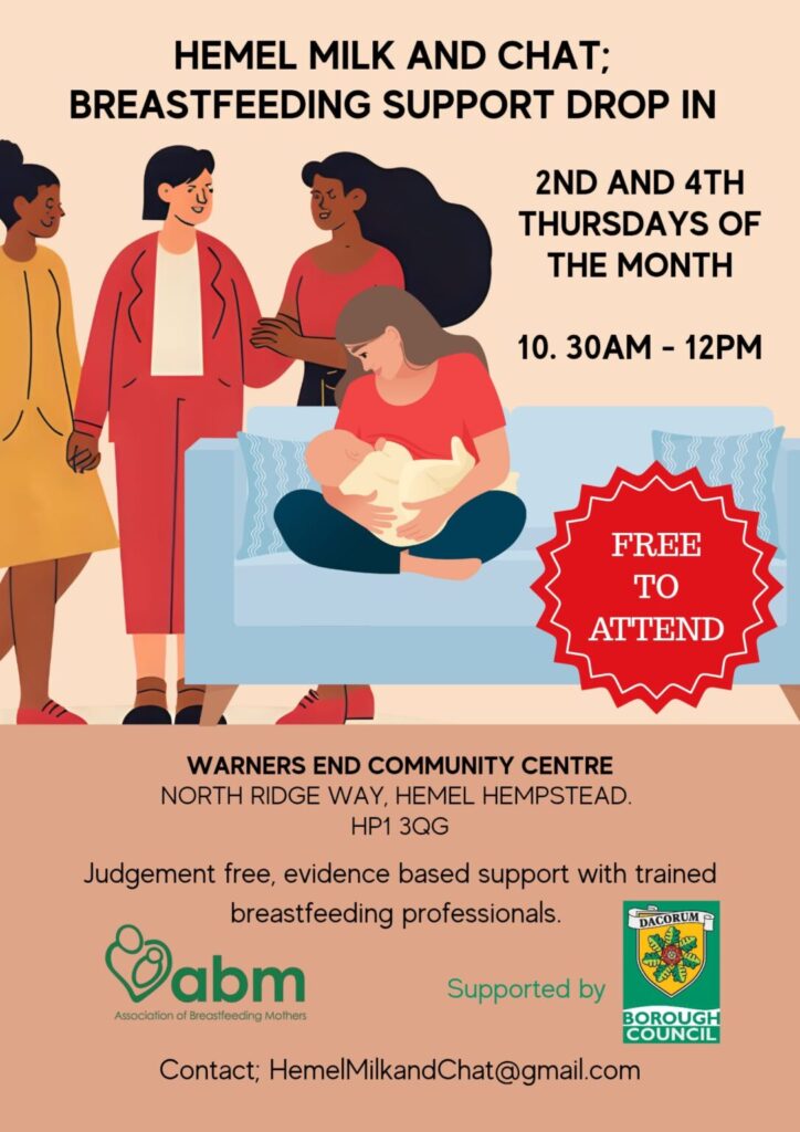 Hemel milk and chat breastfeeding support drop in on the 2nd and 4th Thursday of the month from 10.30am – 12 noon. At Warners End Community Centre, Northridge Way, Warners End, Hemel Hempstead, HP1 3QG. Until at least 23rd July.