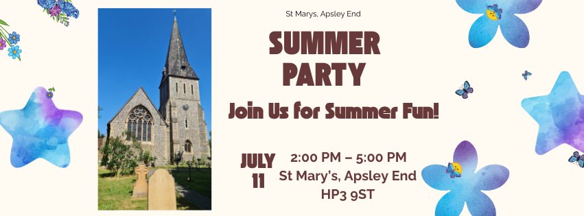 Annual Summer Party and Fair, With games, stalls and food, local artists and craftsmen selling their products. At St Mary’s Church, London Road, Apsley, Hemel Hempstead, HP3 9ST. Saturday 11th July from 2pm – 5pm.